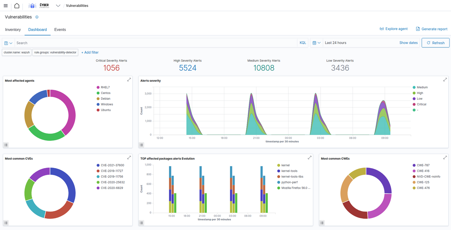 Quickly and Easily see a High-level overview of past trends and detections. View # of connected agents, Known vulnerabilities, Top threat actors, and Tactics